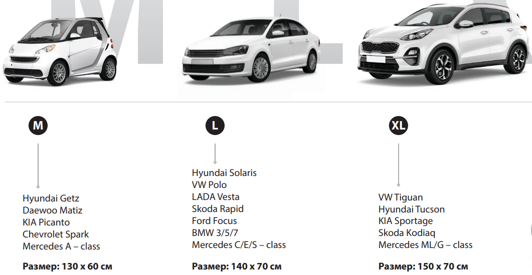 Размер "L" оптимален для самых популярных городских седанов: Hyundai Solaris, Volkswagen Polo, Lada Vesta, Skoda Rapid, BMW 3 и 5 серий, Mercedes класса C и E.