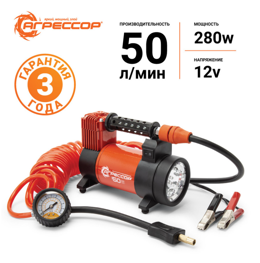 Автомобильный компрессор Агрессор AGR-50Lс LED-фонарем — для накачивания шин легковых автомобилей, кроссоверов, внедорожников и коммерческого транспорта. С производительностью 50 л/мин и максимальным давлением до 10 атм, он справляется с любыми задачами быстро и эффективно. Подключается напрямую к АКБ.