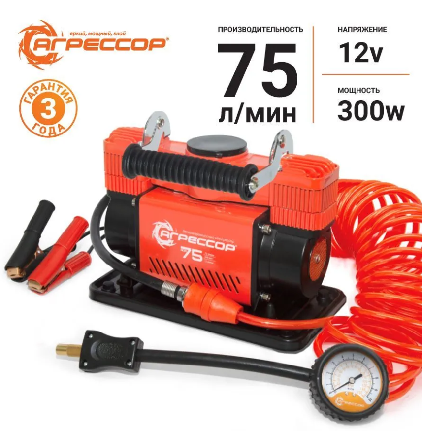 Представляем вам настоящий хит – двухпоршневой автомобильный компрессор AGR-75 предназначенный для накачивания шин легковых автомобилей, кроссоверов, внедорожников, а также лёгкого коммерческого транспорта. Имеет производительность 75 л/мин и создаёт максимальное давление 10 Атм. Подключается к клеммам аккумулятора. Напряжение 12V.