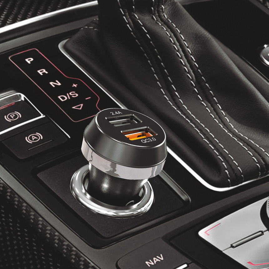 Автомобильное зарядное устройство "KODAK", 2 USB-порта, 1 USB порт быстрой зарядки Qualcomm Quick Charge 3.0, 1 USB порт 5 В/2.4 А, постоянное напряжение на входе: 12-24 В. напряжение и сила тока на выходе: 5 В/3,0 A, 9 В/2,0 A, 12 В/1,5 A,