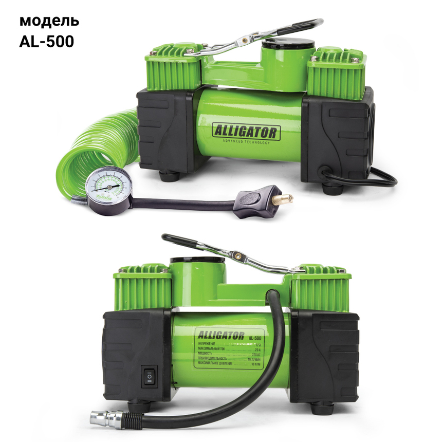 Самая мощная модель серии ALLIGATOR — двухпоршневой компрессор AL-500. Особенности модели: встроенный фонарь, защита от перегрева, шланг-удлинитель длиной 4 м. Два поршня распределяют нагрузку и тем самым снижают износ электродвигателя. Корпус модели сделан из высококачественного металла. Питание компрессора осуществляется от аккумулятора автомобиля, к которому он подключается через зажимы АКБ.