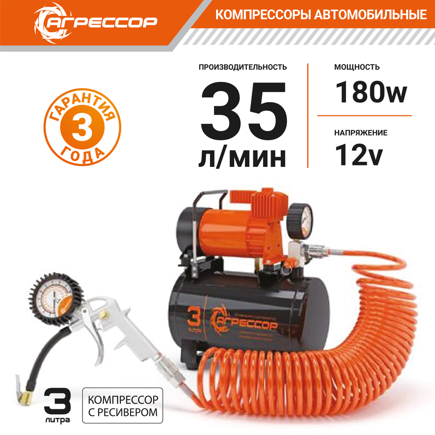 Компрессор воздушный АГРЕССОР с ресивером 3 л.,, 12V/14A, 180W, 8 Атм., 35 л./мин., съёмный шланг 10 м., "пистолет" для накач. шин, переходник для пневмо инструмента, питание от прикуривателя, переходник с зажимами АКБ, клапан сброса давления, набор из 4-х переходников для надувн. изделий