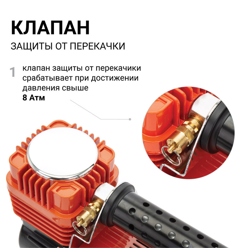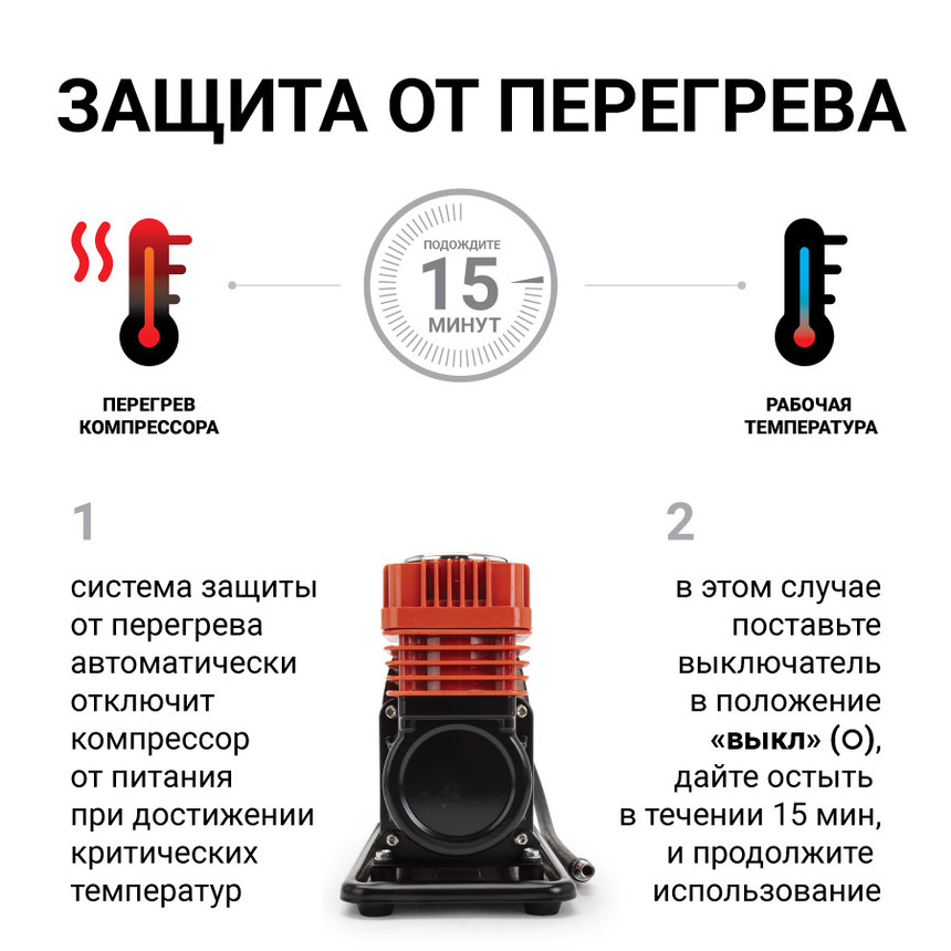 AGR-160 имеет встроенную защиту от перегрева - такая функция не позволит компрессору выйти из строя при несоблюдении рекомендуемого времени непрерывной работы или при работе в условиях повышенных нагрузок. Так же компрессор оборудован клапаном защиты от перекачки, срабатывающим при достижении давления более 8 Атм.