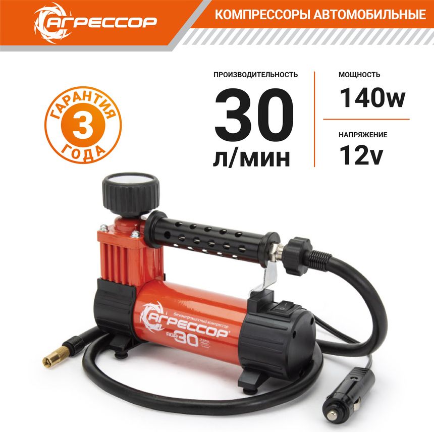 Автомобильный компрессор AGR-30 предназначен для накачивания шин легковых автомобилей и кроссоверов. Имеет производительность 30 л/мин и создаёт максимальное давление 7 Атм. Подключается к розетке прикуривателя. Напряжение 12V.