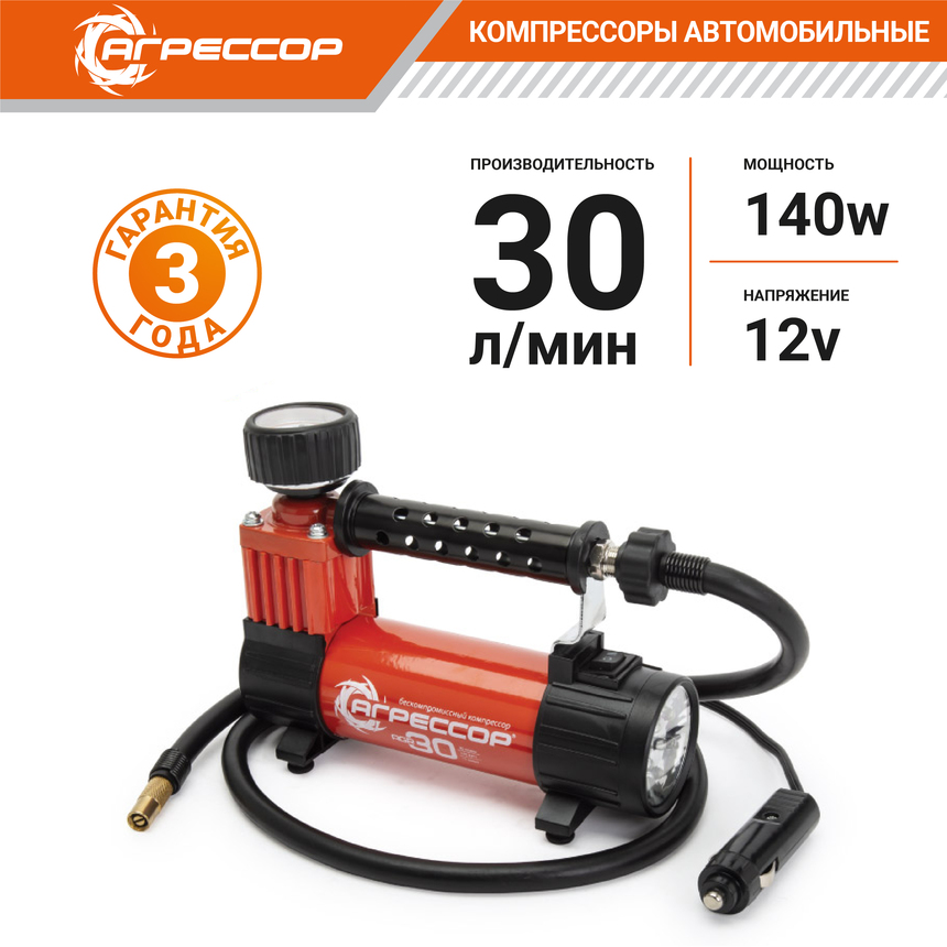 Автомобильный компрессор AGR-30L предназначен для накачивания шин легковых автомобилей и кроссоверов. Имеет производительность 30 л/мин и создаёт максимальное давление 7 Атм. Подключается к розетке прикуривателя. Напряжение 12V.