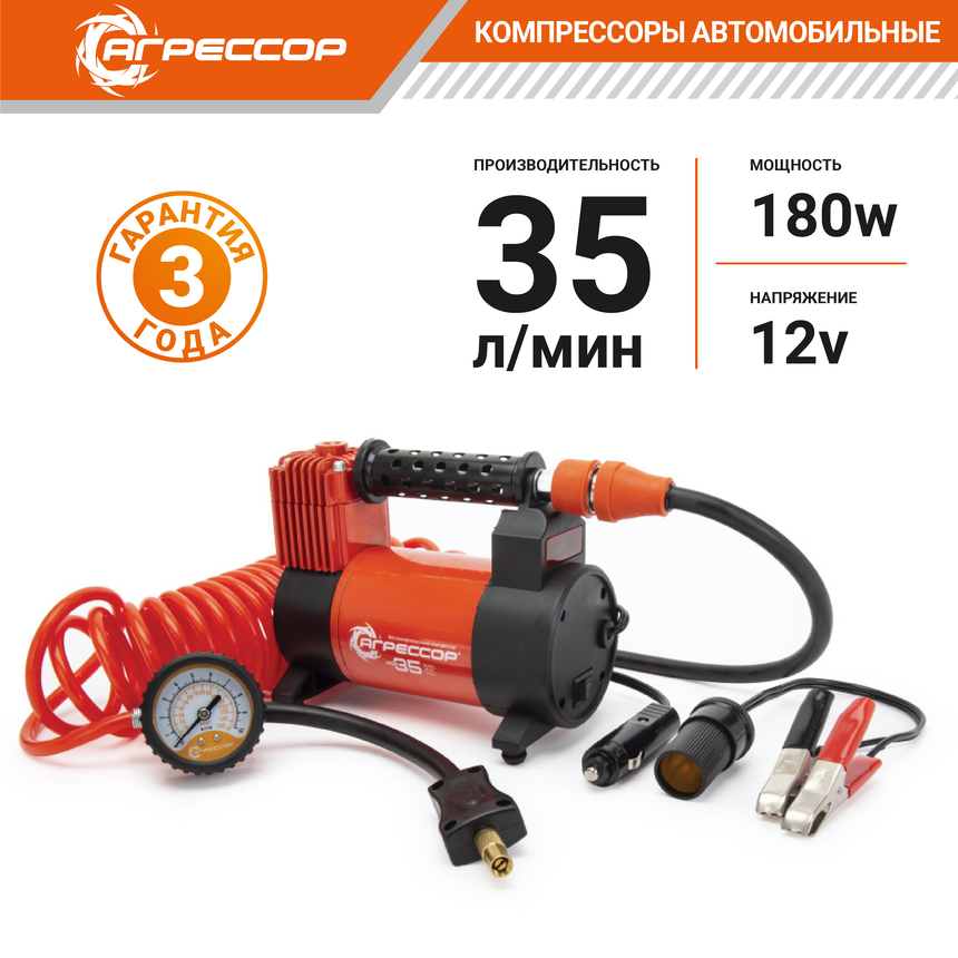 Автомобильный компрессор AGR-35 предназначен для накачивания шин легковых автомобилей и кроссоверов. Имеет производительность 35 л/мин и создаёт максимальное давление 10 Атм. Подключается к розетке прикуривателя и к клеммам АКБ через переходник из комплекта поставки. Напряжение 12V.