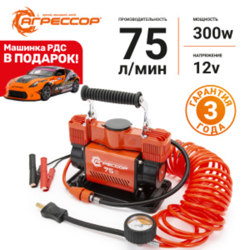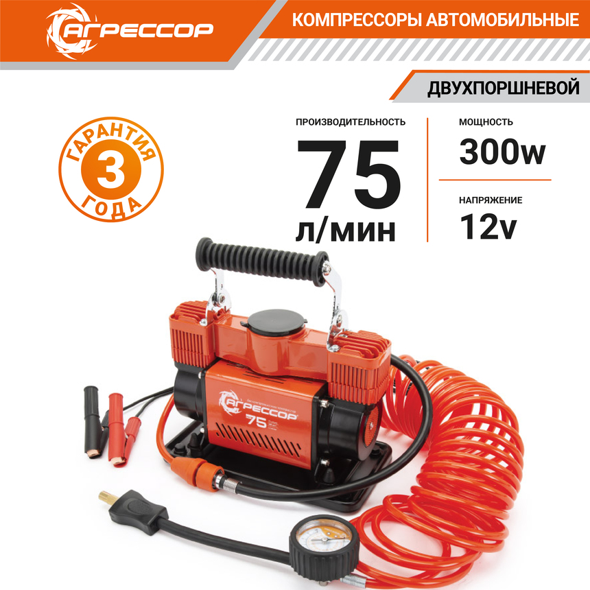 Двухпоршневой автомобильный компрессор AGR-75 предназначен для накачивания шин легковых автомобилей, кроссоверов, внедорожников, а также лёгкого коммерческого транспорта. Имеет производительность 75 л/мин и создаёт максимальное давление 10 Атм. Подключается к клеммам. Напряжение 12V.
