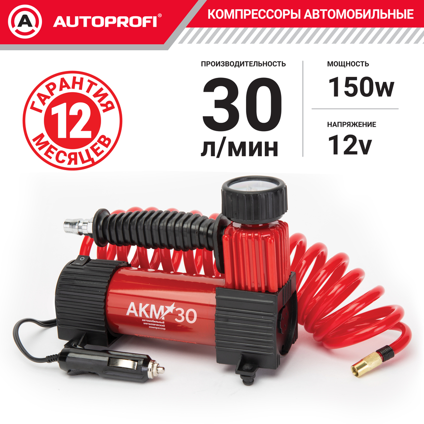 Линейка компрессоров AUTOPROFI серия АКМ - это новый дизайн, хорошая производительность, и комплектация, включающая в себя все необходимое. Металлический корпус и цельнометаллический поршневой насос на всех компрессорах линейки АКМ. Компрессор АКМ-30 оборудован защитой от перегрева, точным двушкальным манометром, быстросъемным шлангом, кабелем питания 3 метровой длины и удобной сумкой для хранения и переноски. Компрессор позволяет полностью удовлетворить ожидания потребителей, которые ищут «ЗОЛОТУЮ СЕРЕДИНУ», при этом оставаясь полноценными компрессорами для накачивания шин автомобилей, велосипедов и других надувных изделий.