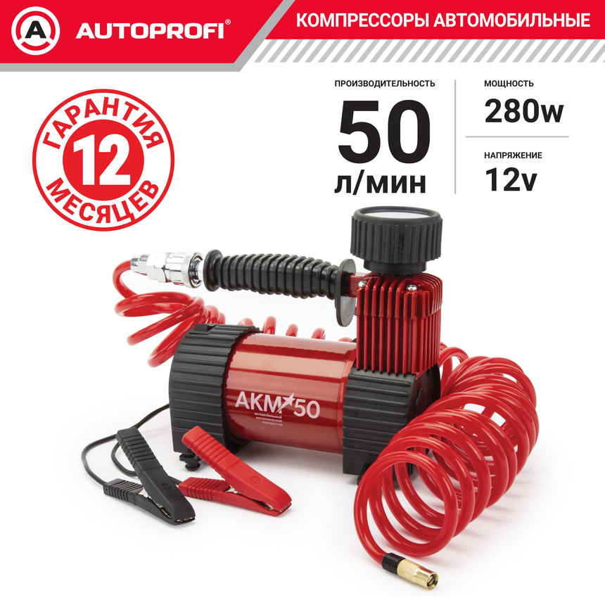 Линейка компрессоров AUTOPROFI серия АКМ - это новый дизайн, хорошая производительность, и комплектация, включающая в себя все необходимое. Металлический корпус и цельнометаллический поршневой насос на всех компрессорах линейки АКМ. Компрессор АКМ-50 оборудован защитой от перегрева, точным двушкальным манометром, быстросъемным шлангом, кабелем питания 3 метровой длины и удобной сумкой для хранения и переноски. Компрессор позволяет полностью удовлетворить ожидания потребителей, которые ищут «ЗОЛОТУЮ СЕРЕДИНУ», при этом оставаясь полноценными компрессорами для накачивания шин автомобилей, велосипедов и других надувных изделий.