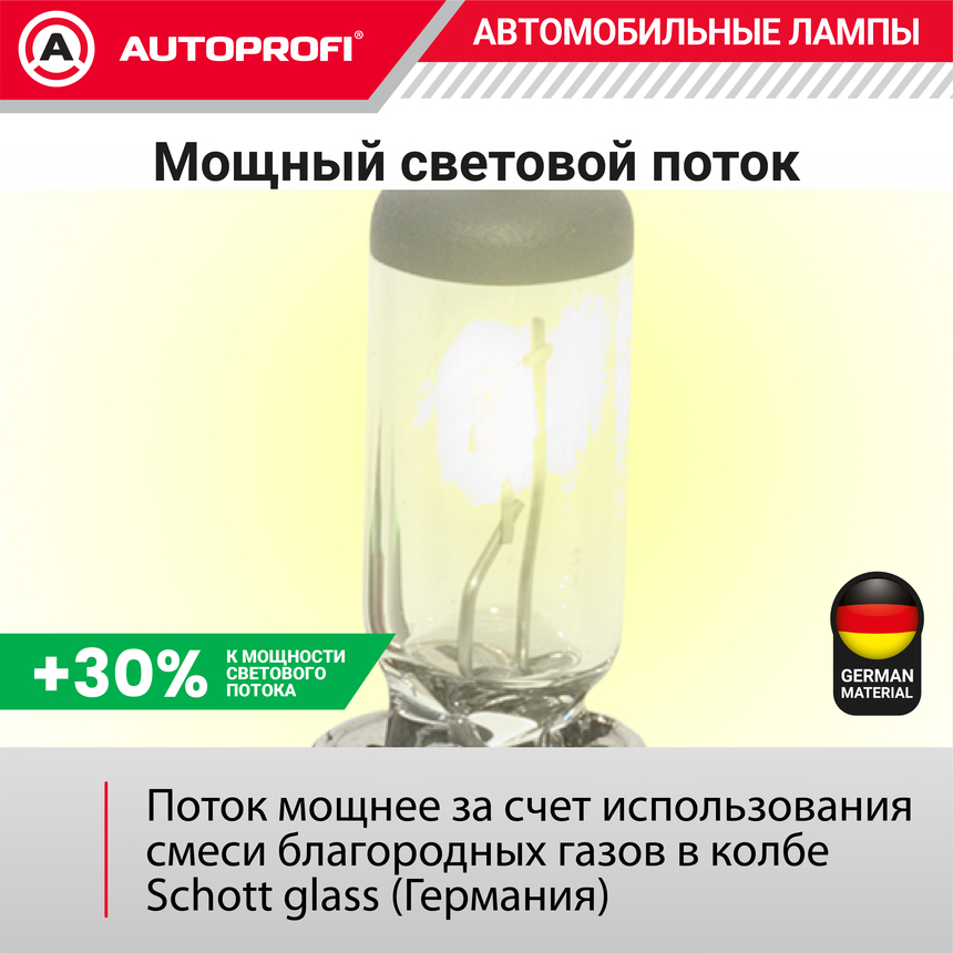 Компания AUTOPROFI выводит на рынок лампы с мощностью соответствующей требованиям автопроизводителей, при этом, модели серии LONG LIFE (+30%) дают более мощный световой поток только за счет использования смеси благородных газов в колбе и правильно подобранной толщины спирали накала. Кварцевое стекло ламп AUTOPROFI защищает автомобильную фару изнутри от ультрафиолетового излучения. ЭТО ЗНАЧИТЕЛЬНО ПРОДЛЕВАЕТ РЕСУРС дорогостоящих фар современного автомобиля. Фары дольше сохраняют прозрачность, тем самым, делая езду в тёмное время суток – безопасной.