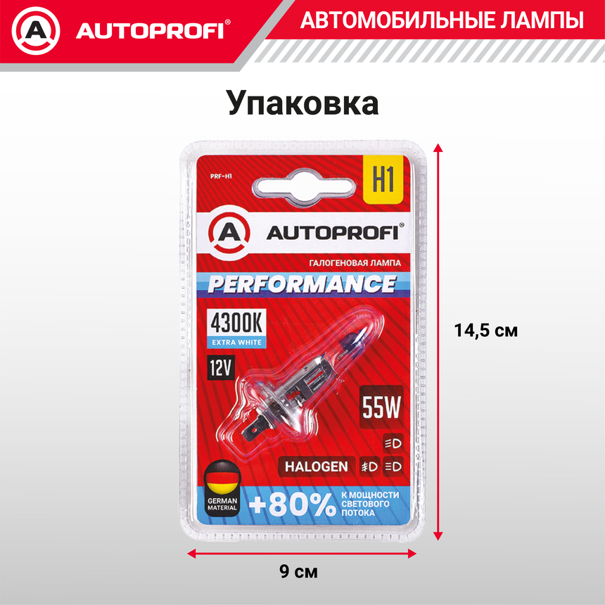 Линейка галогеновых ламп AUTOPROFI PERFORMANCE - лампы с улучшенными техническими характеристиками и световым потоком на 80% мощнее чем у стандартных галогеновых ламп. Расчетный срок службы в трое превышающий обычные лампы. Специальное нанесение на колбу обеспечивает более белый спектр свечения (4300К).