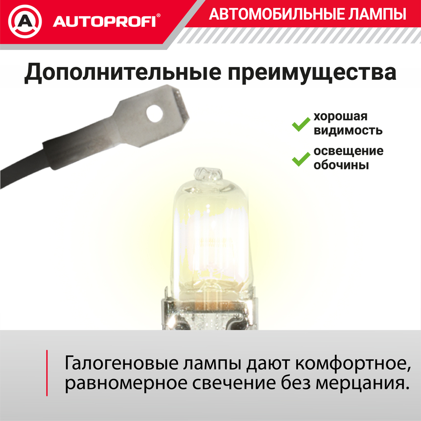Линейка галогеновых ламп AUTOPROFI STANDART – это доступный и одновременно необходимый компонент для исправной работы головного света современного автомобиля. Ключевое преимущество ламп линейки AUTOPROFI STANDART – наилучшее соотношение стоимости, ресурса и эффективности.
