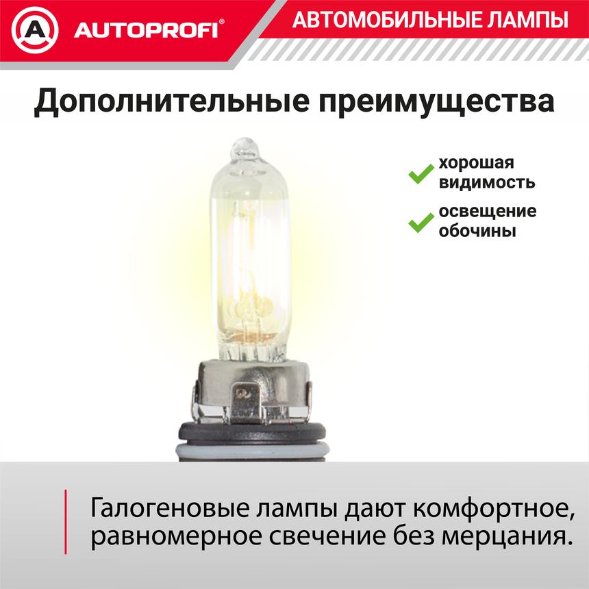 Линейка галогеновых ламп AUTOPROFI STANDART – это доступный и одновременно необходимый компонент для исправной работы головного света современного автомобиля. Ключевое преимущество ламп линейки AUTOPROFI STANDART – наилучшее соотношение стоимости, ресурса и эффективности.