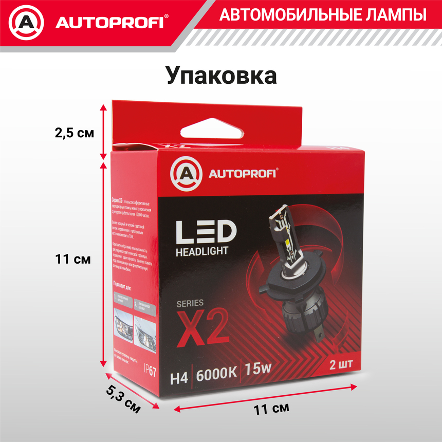 Лампа светодиодная Autoprofi, Х2 компак, H4, 12V / 15W, 6000K, 4000 Lm, комплект 2 шт.