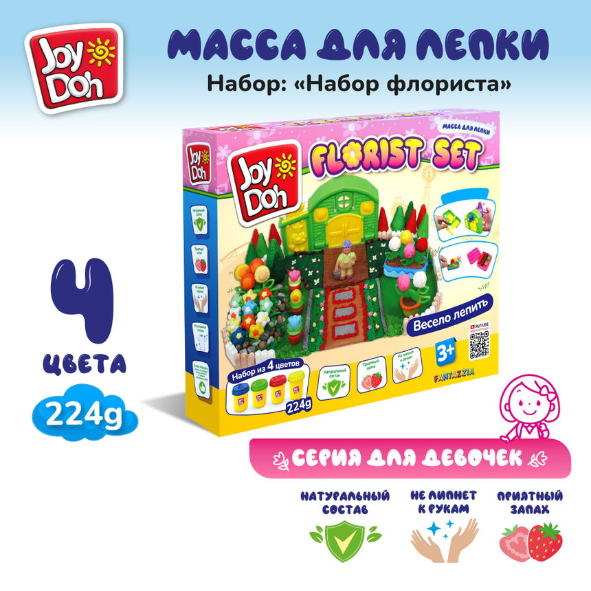 Масса для лепки Joy Doh, набор FLORIST SET - НАБОР ФЛОРИСТА, форма дома, 3d формы, 22 аксессуаров, 4 баночки с тестом (4 x 56 г.)