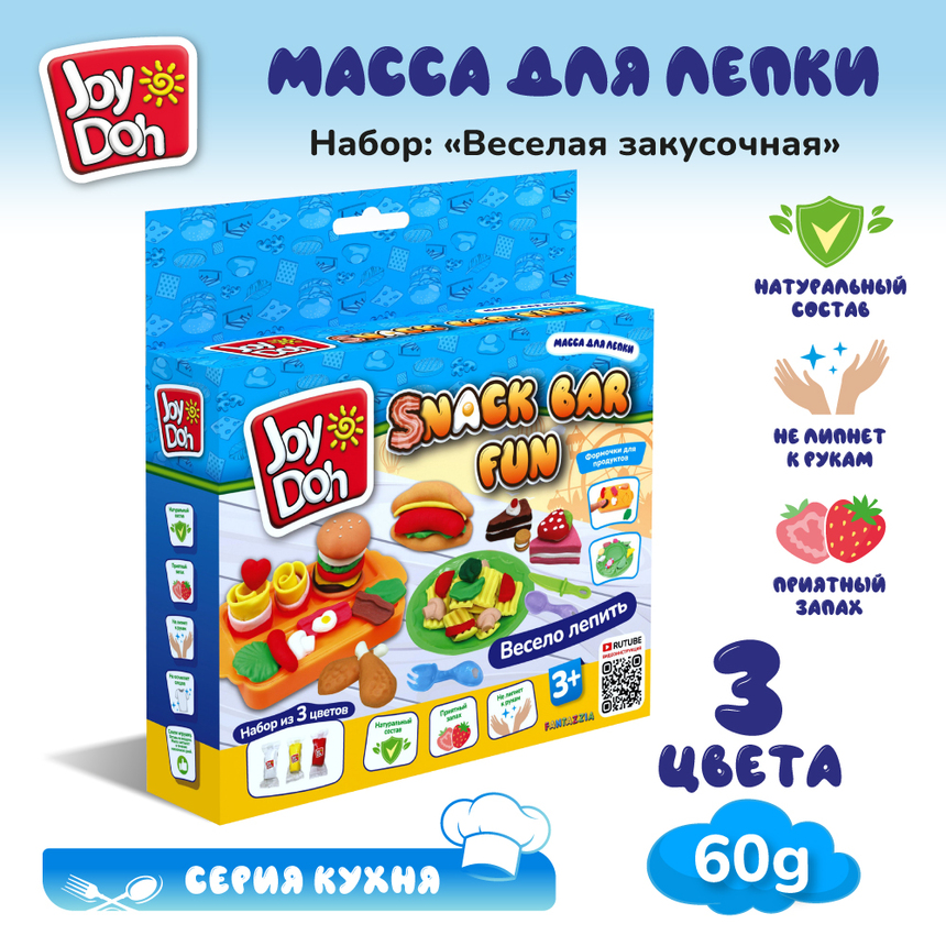 Масса для лепки Joy Doh, набор SNACK BAR FUN - ВЕСЕЛАЯ ЗАКУСОЧНАЯ, поднос с пресс-формами, 5 аксессуаров, 3 пакетика с тестом, (3 х 20г.)