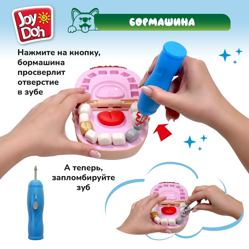 Ваш малыш любит играть в доктора? Набор для лепки «Dentist Set» от Joy-Doh поможет вашему ребенку почувствовать себя настоящим стоматологом! Малыш сам сможет слепить зубки пациенту, просверлить их с помощью бормашины и поставить пломбу или брекеты, а также почистить зубы! В наборе есть золотистая и серебристая масса для лепки, при помощи которой можно слепить золотой зуб или стальную нить для брекетов. А механическая бормашина, зеркальце и ролик для изготовления брекетов совсем как у настоящего зубного врача.