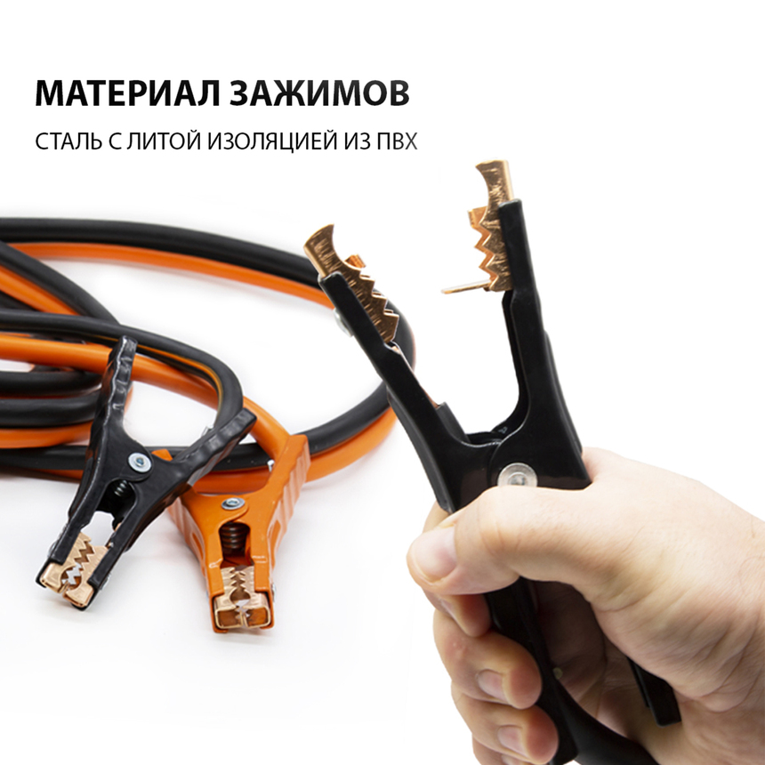 Многожильные провода изготовлены из чистой меди, которая обладает высокой пластичностью и электропроводностью, и покрыты изоляцией из морозостойкого термопласта. Термопласт легко гнётся и не теряет свою эластичность до температуры -50 °С. Увеличенная площадь контакта с клеммами обеспечивает быстрое и надёжное «прикуривание» в любых условиях.
