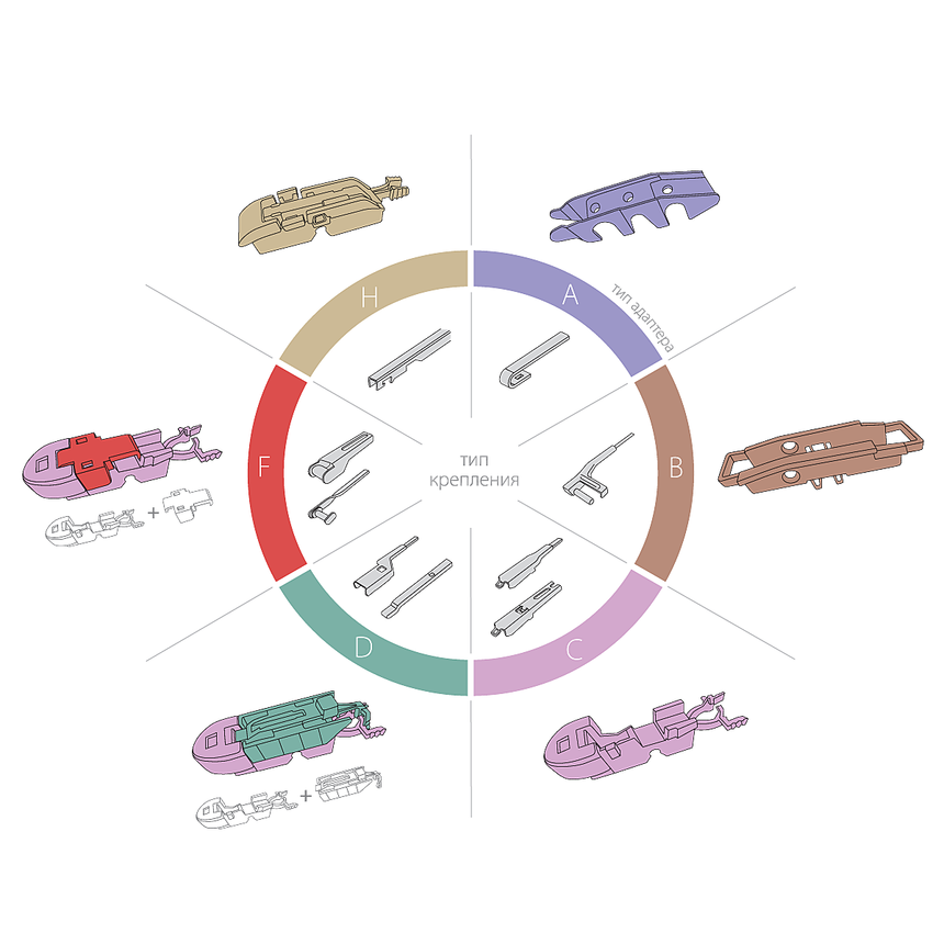 В комплекте с щёткой поставляется набор адаптеров под 99% креплений стеклоочистителя автомобиля отечественного или иностранного производства. Совместимы с леворульными и праворульными машинами.