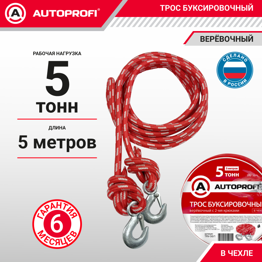 Трос буксировочный веревочный "AUTOPROFI" 5 т, 5 м, 2 крюка, сумка TRV-50/1