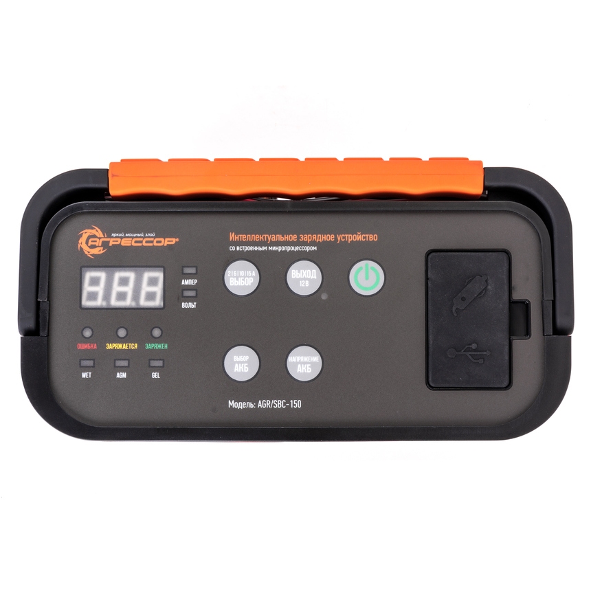 Цифровое зарядное устройство "Агрессор", 9 фаз зарядки, ток 2/6/10/15А, 12V/15А розетка, 5V/1A USB, для 12V АКБ (WET, AGM, GEL)