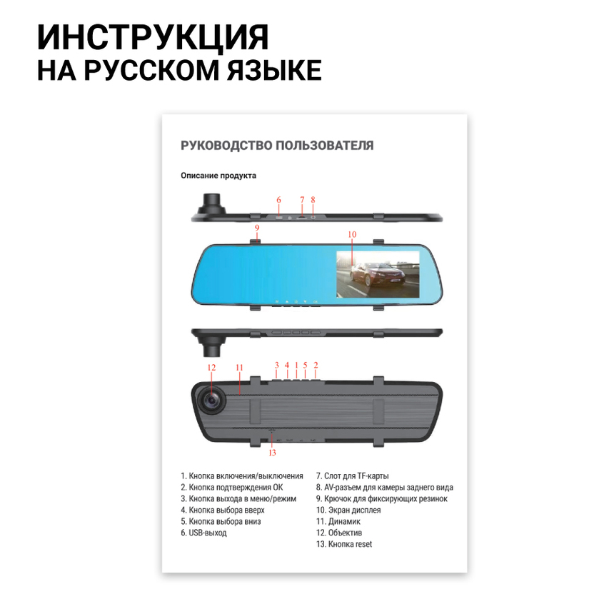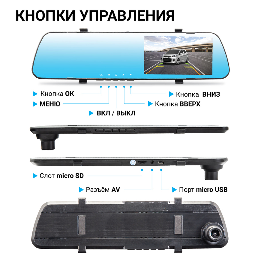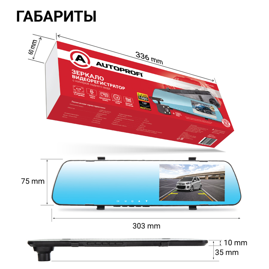 Видеорегистратор 1080Р, угол обзора 120°, дисплей 4,19", камера заднего вида MIR-42RC
