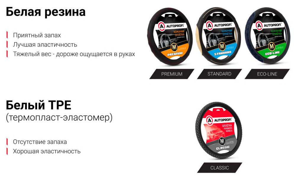 Оплетки AUTOPROFI серии Classic выполнены из высококачественной экокожи, которая сочетает в себе стильный внешний вид и долговечность. Основа оплетки изготовлена из материала белого TPE (термопласт-эластомер), который обеспечивает отсутствие запаха, отличную фиксацию, устойчивость к механическим повреждениям и комфортное ощущение во время вождения.